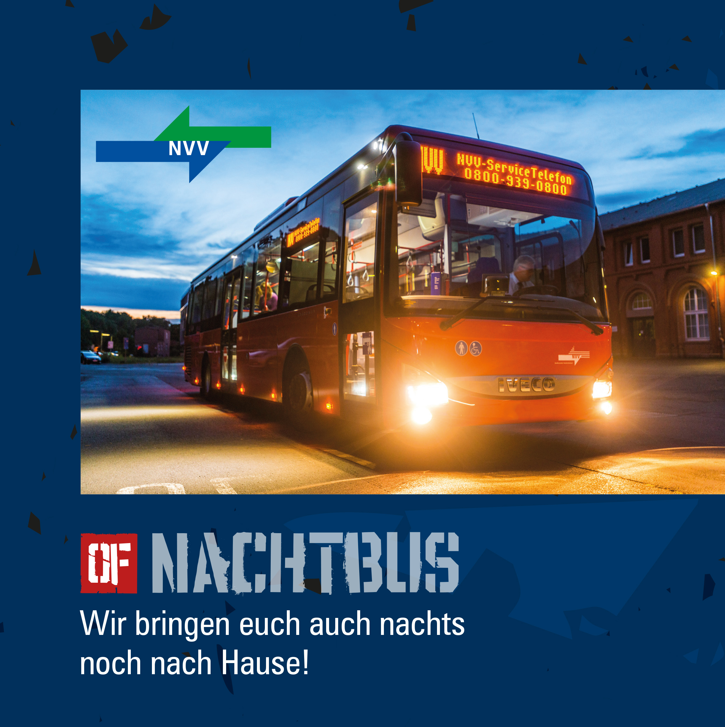 Wir bieten in Kooperation mit dem NVV einen Nachtbus-Verkehr an. Dieser fährt von Mittwoch bis Sonntag in alle Himmelsrichtungen verschiedene Orte der Region an. Es gilt der normale NVV-Tarif.