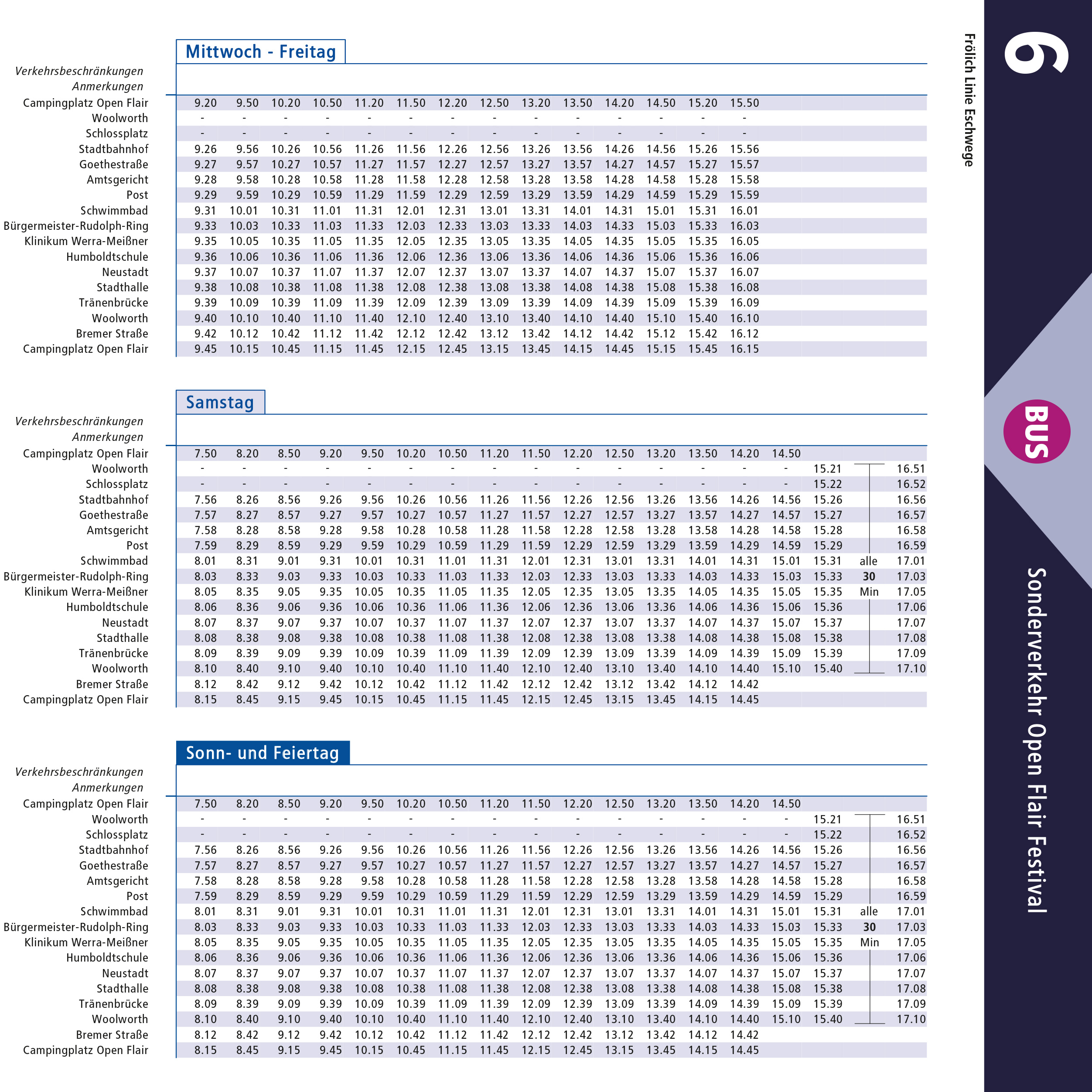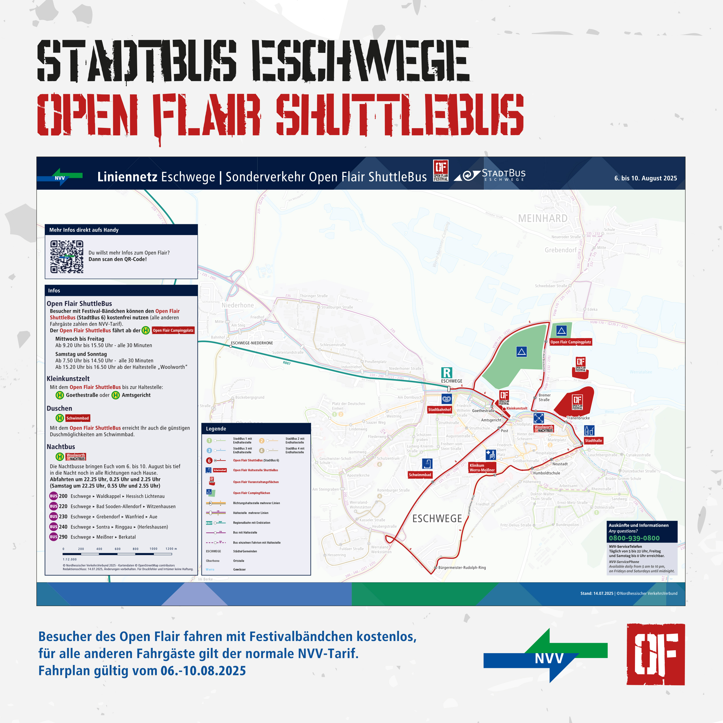 Wir sind ein Stadt-Festival, deswegen gibt es natürlich auch einen StadtBus. Und damit bringen das Open Flair und der NVV Euch zu allen wichtigen Orten. Mit dem Shuttle kommt ihr bequem zum Bahnhof, ins Schwimmbad, zum Krankenhaus, zu Einkaufsmöglichkeiten oder einfach mal quer durch Eschwege.