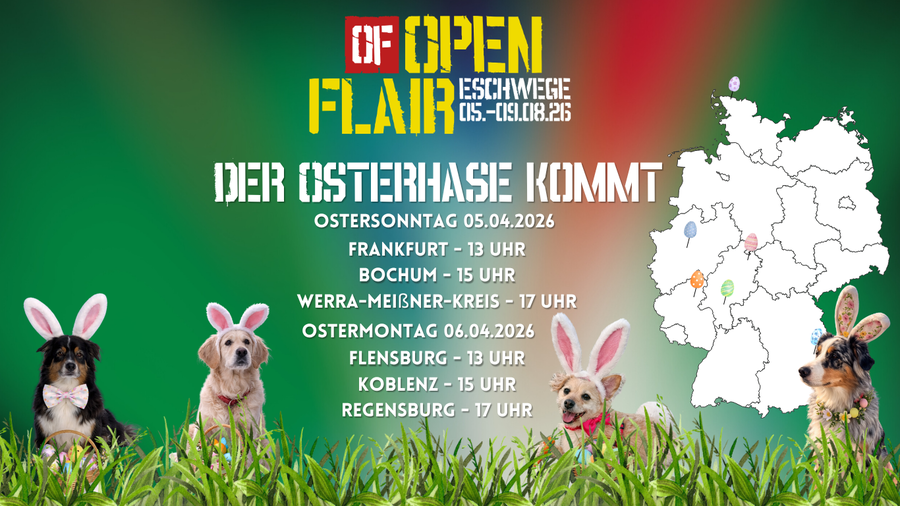 Auch in diesem Jahr macht sich der Open Flair Osterhase wieder am Ostersonntag und Ostermontag in ganz Deutschland auf, um Osterkörbchen mit Open Flair Tickets für euch zu verstecken! 🐣🐰